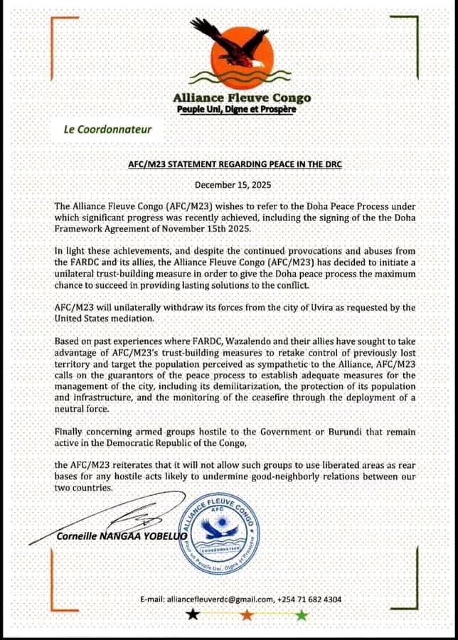 L’Alliance Fleuve Congo, annonce sa décision de retirer ses forces de la ville d’Uvira, dans la province du Sud-Kivu. Cette annonce figure dans un communiqué officiel daté du 15 décembre 2025, signé par son coordonnateur, Corneille Nangaa.